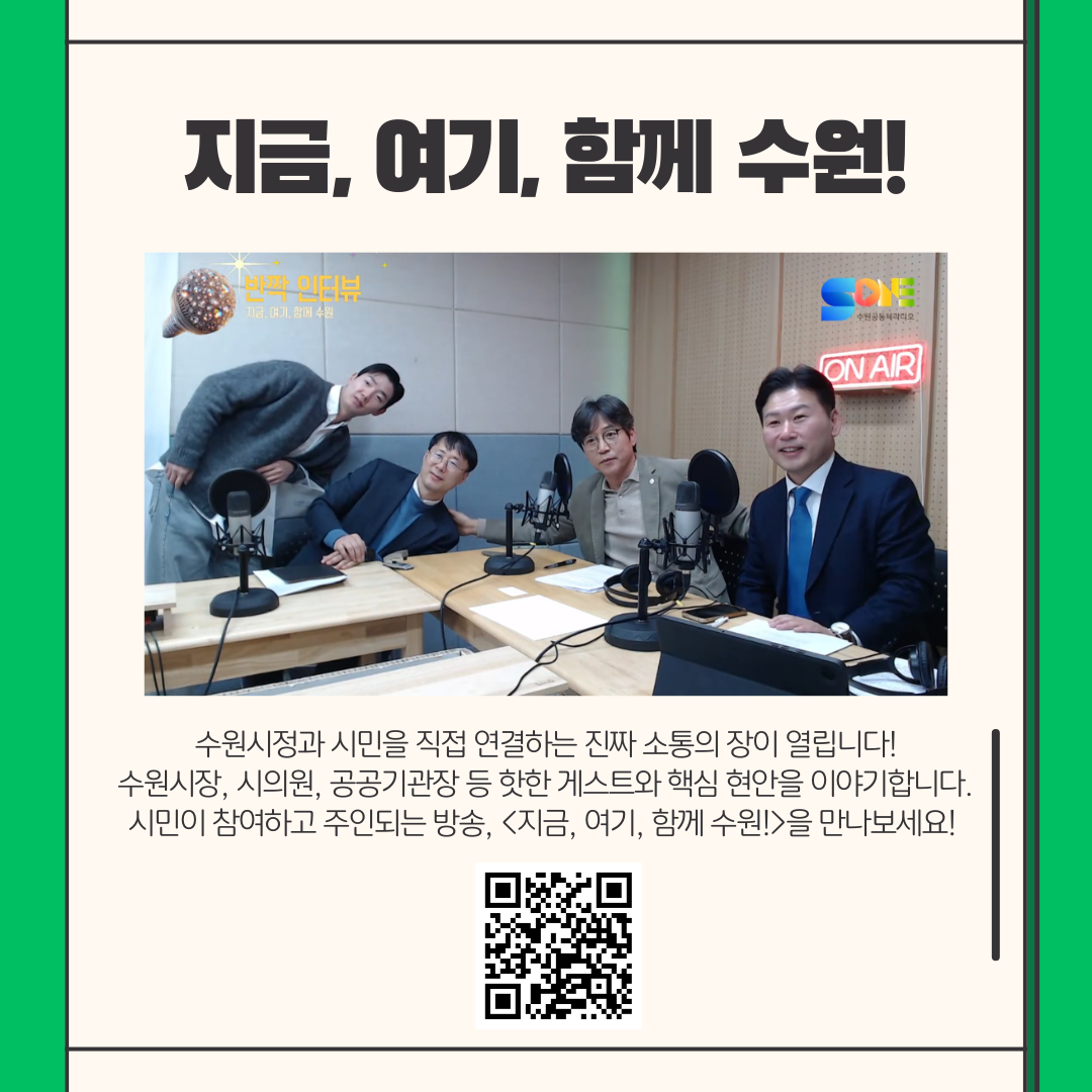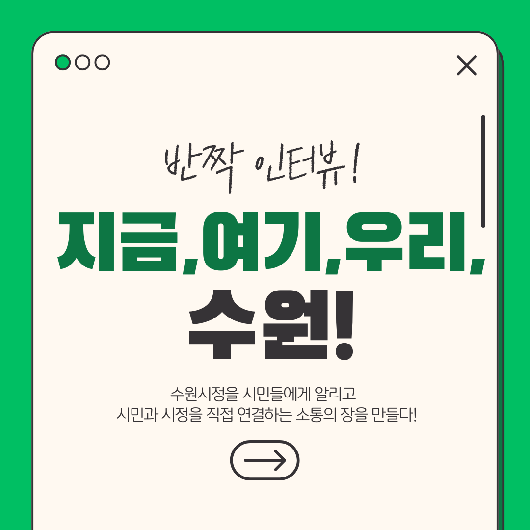 수원시정과 시민을 잇는 소통 방송 <지금, 여기, 함께 수원!> '반짝 인터뷰' 2편을 확인하세요.
