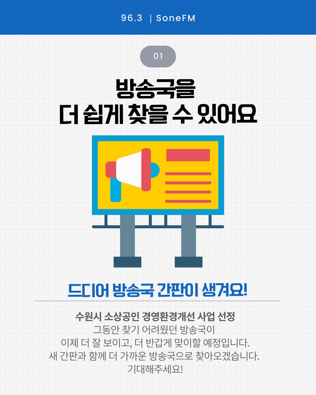 수원시 소상공인 경영환경개선 사업에 선정되어 새 간판을 설치합니다. 더 잘 보이고, 더 가까운 방송국으로 찾아오겠습니다!